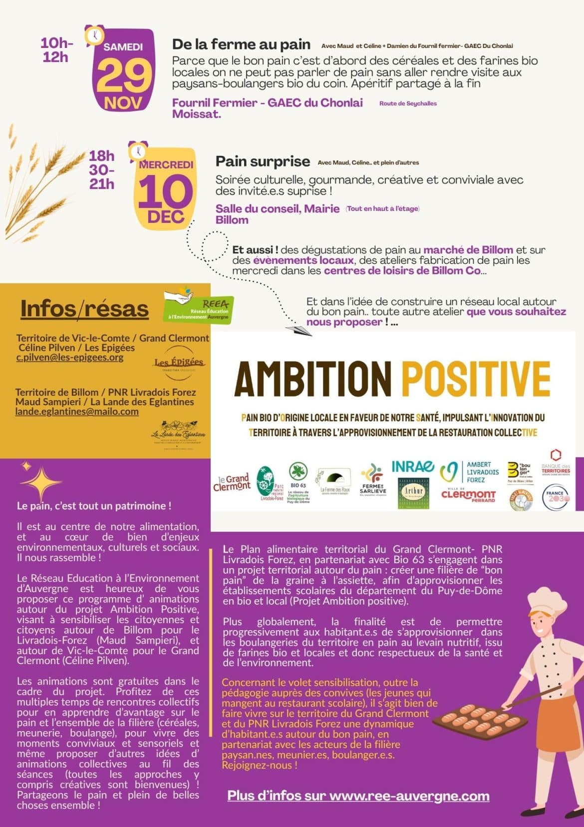 « Ambition Positive » vise à créer une filière locale du “bon pain”, depuis la graine jusqu’à la cantine, en valorisant les céréales anciennes, la meunerie artisanale et la boulangerie au levain. Ce projet s’inscrit dans le Plan alimentaire territorial du Grand Clermont – PNR Livradois-Forez, en partenariat avec Bio 63.