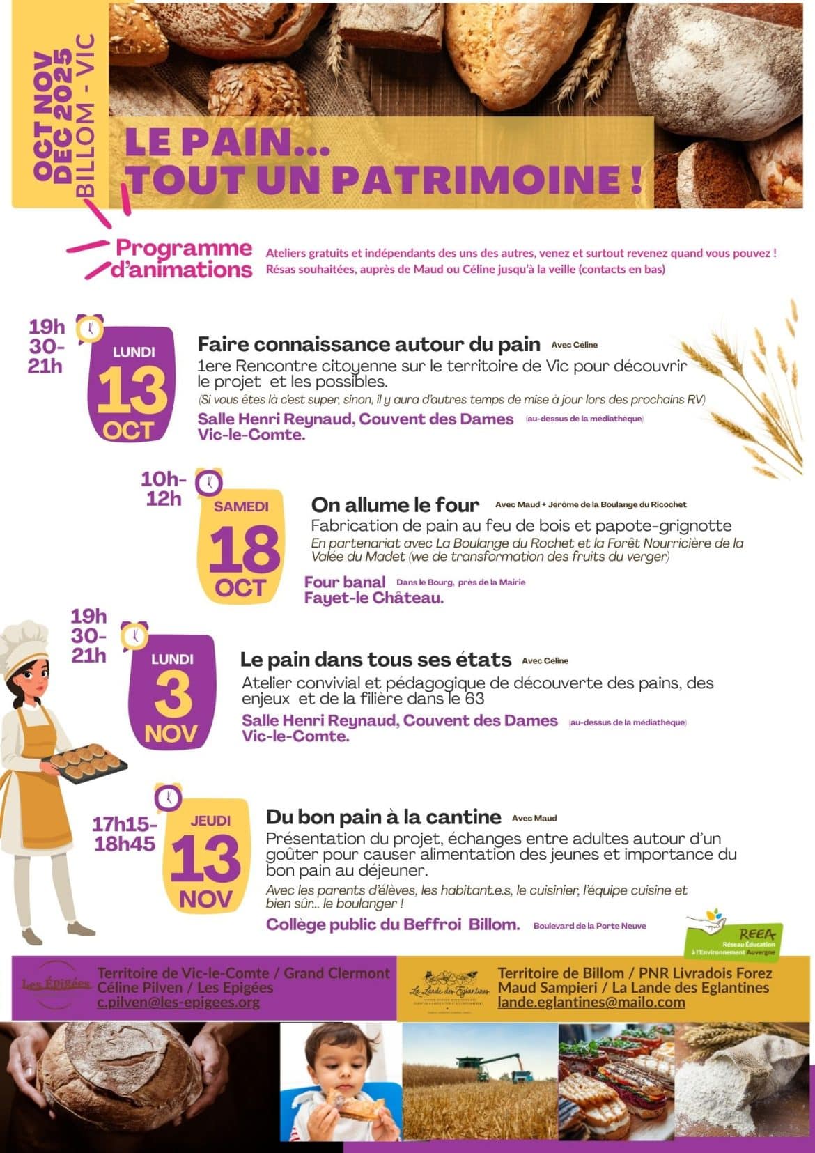 De octobre à décembre 2025, des ateliers conviviaux, citoyens et sensoriels sont proposés sur les territoires de Billom et Vic-le-Comte : fabrication de pain, dégustations, rencontres avec des artisans boulangers, visites de fermes, soirées culturelles…