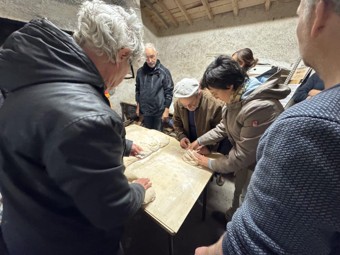Autour du four communal restauré par la commune, les participants ont partagé un moment chaleureux : échanges sur la consommation du pain, apprentissage du façonnage de la pâte, cuisson au feu de bois, discussions sur les farines locales, le levain naturel et la richesse des savoir-faire boulangers.